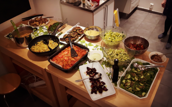 Ja sitten tositoimiin! Kurssilaiset jaettiin kahden-kolmen hengen tiimeihin kokkaamaan yhteensä neljätoista erilaista ruokalajia alkuruoista jälkiruokaan. Kurssi saattoi yhteen hyvin erilaisia ihmisiä, sillä paikalla oli iäkkäämpiä naisia (”kansalaisopiston vakioasiakkaita”), nuoria ruuhkavuosiaikaa eläviä äitejä, pariskuntia ja myös nuoria teinipoikia. Osalle kasvisruoka oli jo tutumpaa, mutta osa oli tullut juuri siksi, ettei osannut itse lähteä kokeilemaankaan kasviskokkailua. Toiminta pienryhmissä oli iloista ja helppoa. Herkkuja syntyikin nopeasti pöytä täyteen! Ruokakurssien hauskin osuus on päästä lopuksi maistelemaan työn tuotoksia. Yhdessä herkutellessa oltiin yhtä mieltä: jos kaikki kokkaisivat ja maistaisivat näitä ruokia, he kyllä ymmärtäisivät kasvisruoan olevan täyttävää, maukasta, ravitsevaa ja helppoa tehdä.