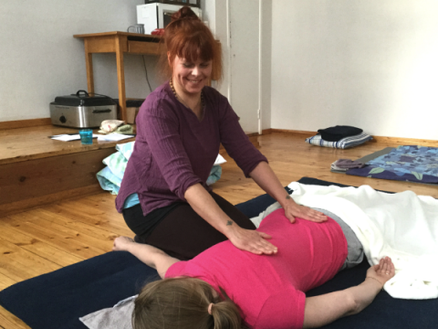 Hoitohuoneen lattialla ovat leveät alustat, joiden päällä peitot ja tyynyt. Kurssin tarkoituksena on oppia käyttämään luontaishoitoja kotikäytössä ja hierontatekniikoita kehon eri osiin. Tämän kertaisen teeman mukaisesti hoitaja painelee hoidettavan selkää shiatsu-tekniikkaa ja akupisteitä käyttäen. Hoidettava asettuu mukavaan lepoasentoon vatsalleen. Hän saa jalkateriensä alle tyynyn ja ristiselän päälle lämpöisen kaurapussin sekä peiton.