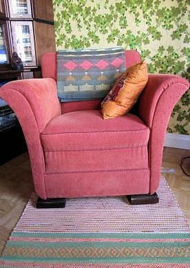 Kun aurinko paistaa, matto muuttuu iloisen väriseksi. Iltahämyssä maton kelta-oranssi-vihreä väri sointuu Ritva Kronlundin Viinirypäle-tapettiin.